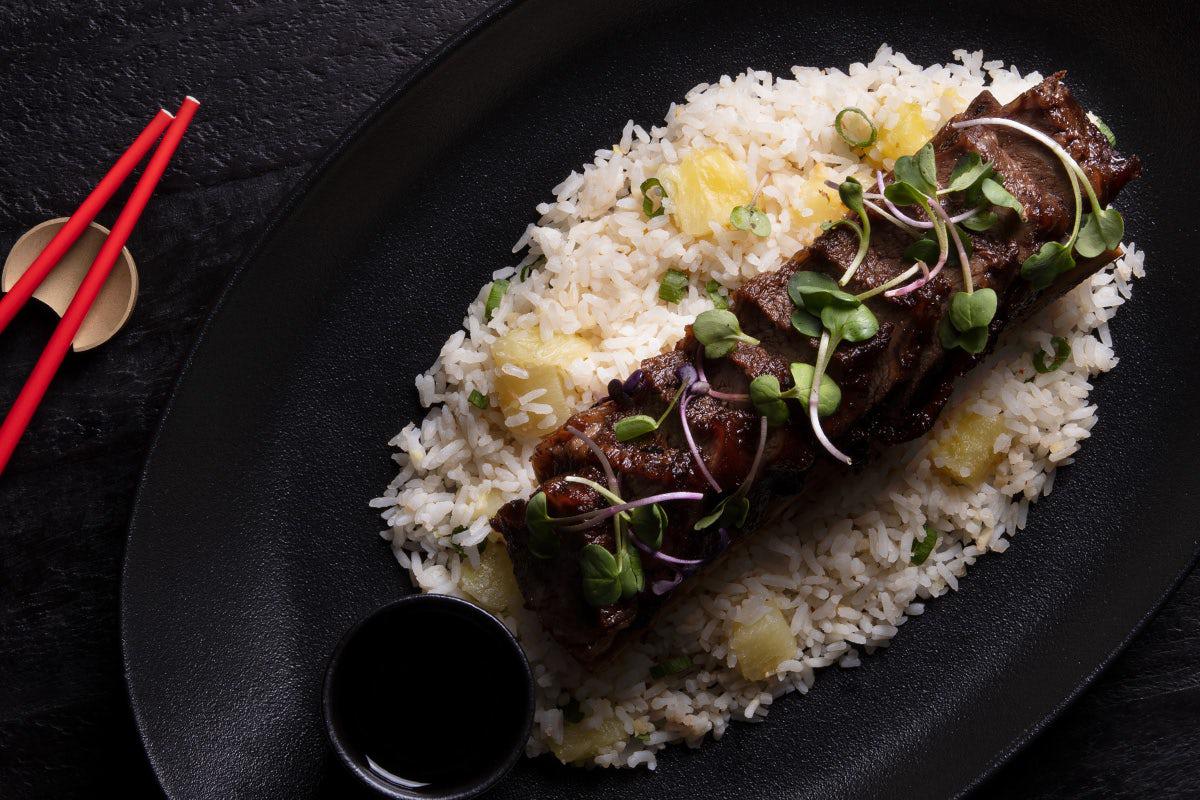 Slow-braised beef short ribs with a savory glaze, served with pineapple fried rice †