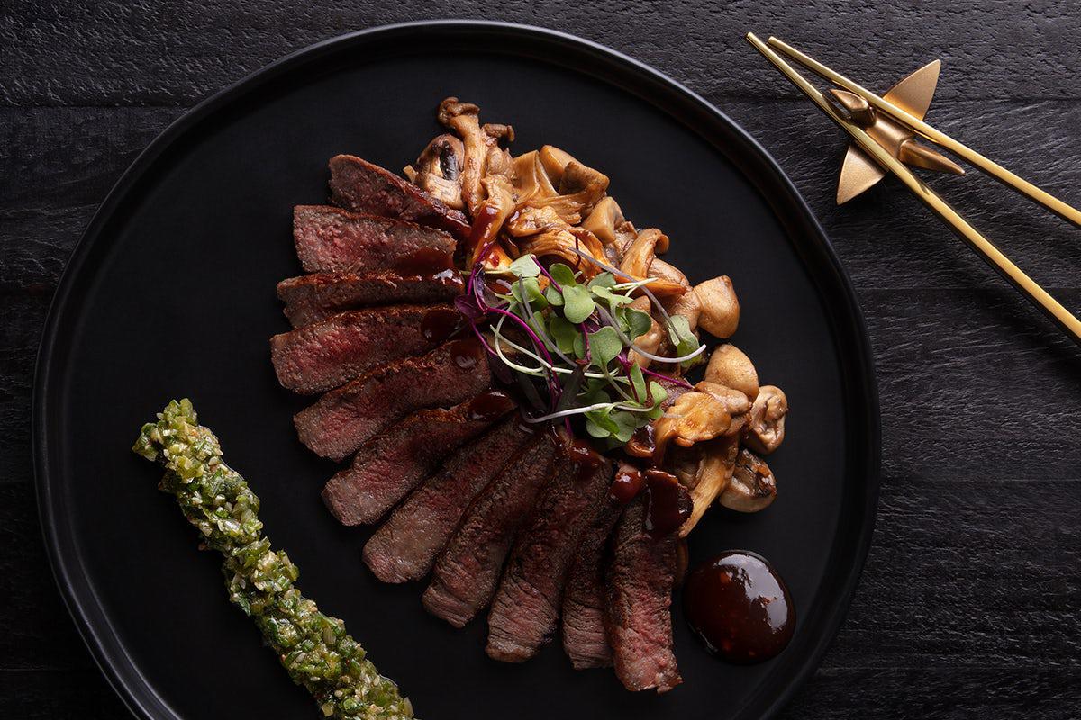 Savory bulgogi glaze, wok-seared mushrooms, Asian chimichurri sauce †