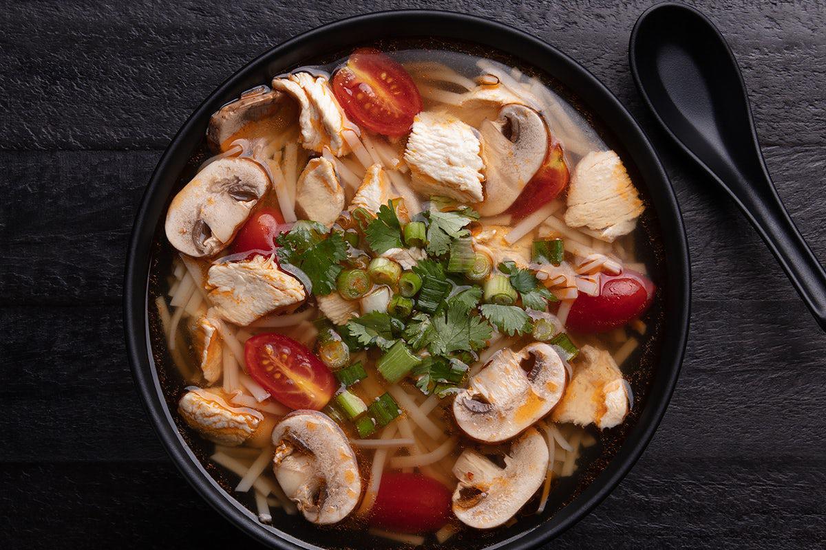 Rich and tangy broth, silken tofu, chicken, bamboo shoots, egg †