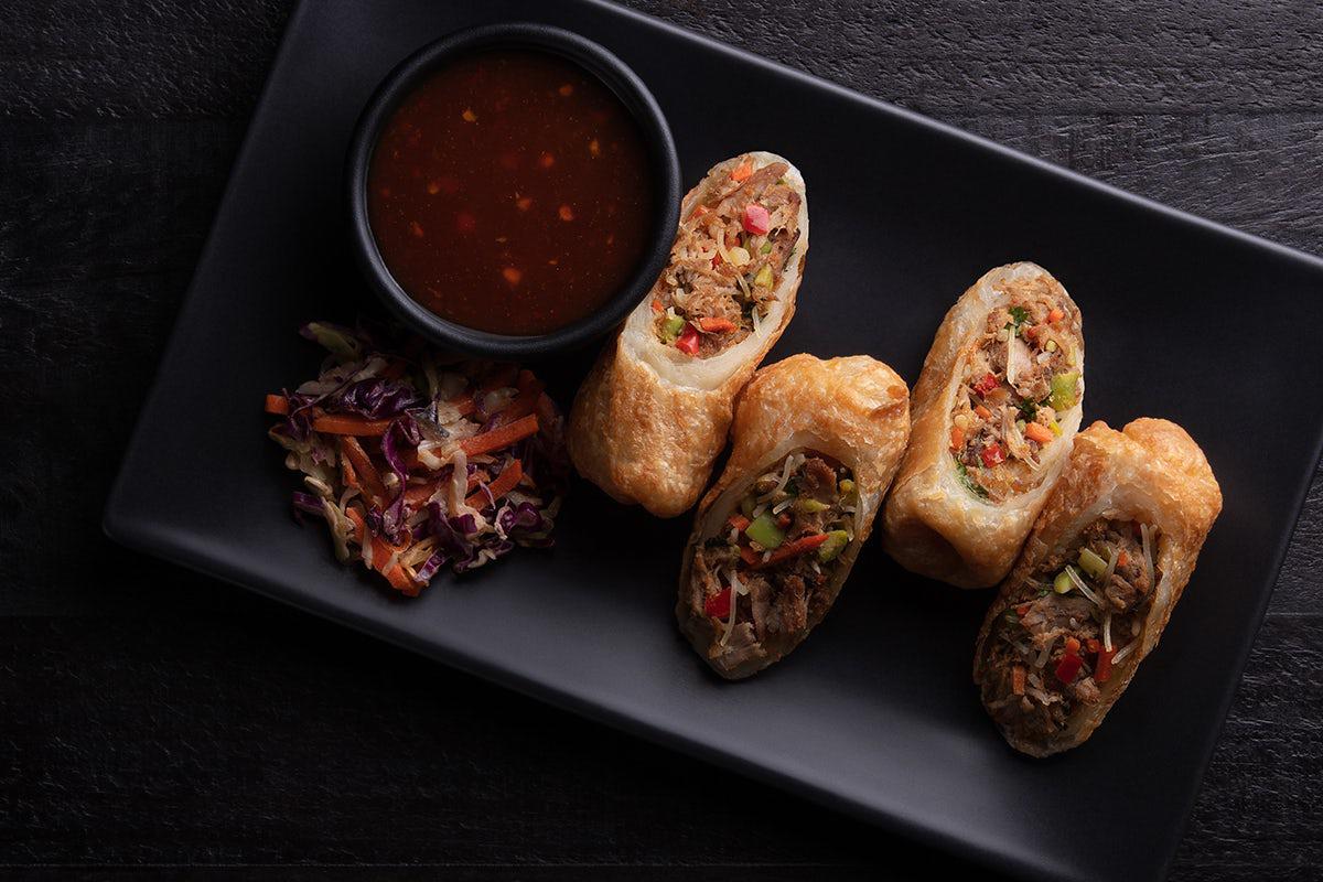 Crispy roti rolls with julienned veggies, sweet-savory dipping sauce Calories listed are per piece