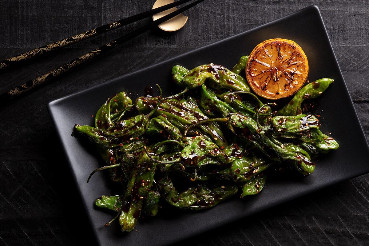 Blistered Japanese peppers in a savory Mongolian sauce †